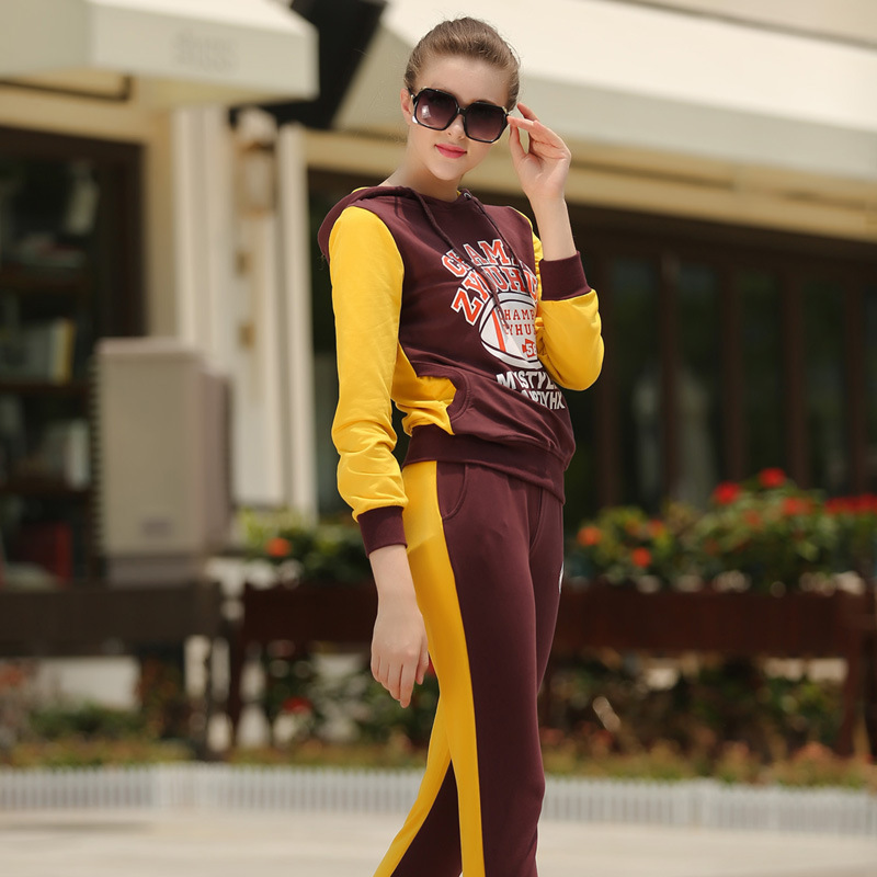 實(shí)拍歐美大牌純棉運(yùn)動套裝印花拼接連帽上衣長褲兩件套女裝批發(fā) /
