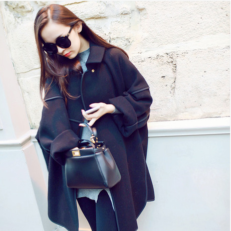 秋風衣包邊斗篷式翻領(lǐng)繭形中長款毛呢子大碼廓形外套大衣女 /