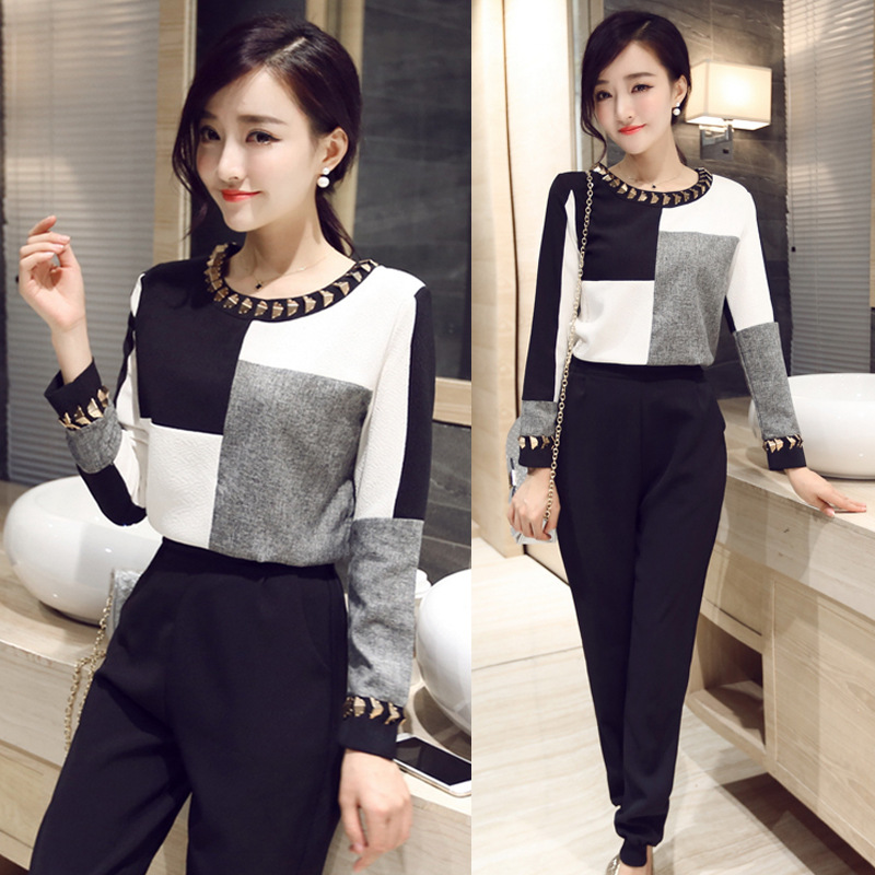 歐洲站2015秋季女裝名媛小香風時尚套裝休閑上衣長褲哈倫褲兩件套 /
