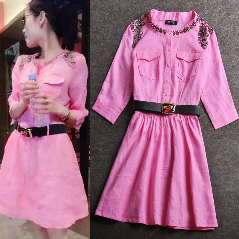 歐洲站代購2015秋季新款釘珠口袋修身大擺七分袖亞麻連衣裙中長裙 /