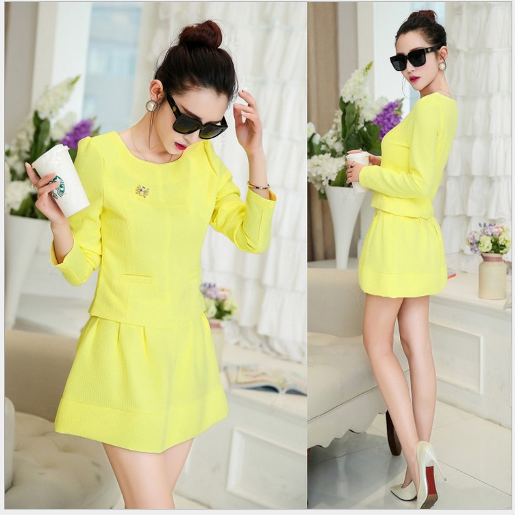 2015秋裝新款韓版純色連衣裙大碼裙套裝女修身氣質(zhì)長袖短裙兩件套 /