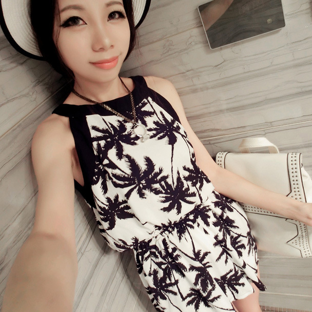 2015夏季新款椰樹印花掛脖無袖收腰雪紡連體褲寬松復古休閑褲H722 /