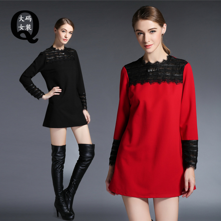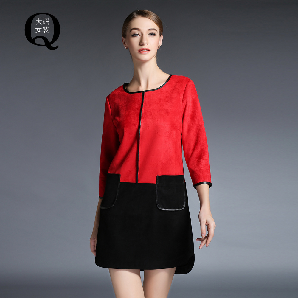 新品女連衣裙歐美大碼女裝秋胖MM修身顯瘦七分袖拼接連衣裙歐洲站 /