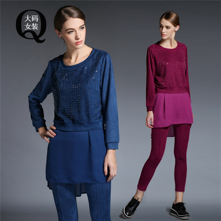 套裝女秋新款女士時(shí)尚套裝大碼胖MM燙鉆兩件套長(zhǎng)款套裝女裝 /