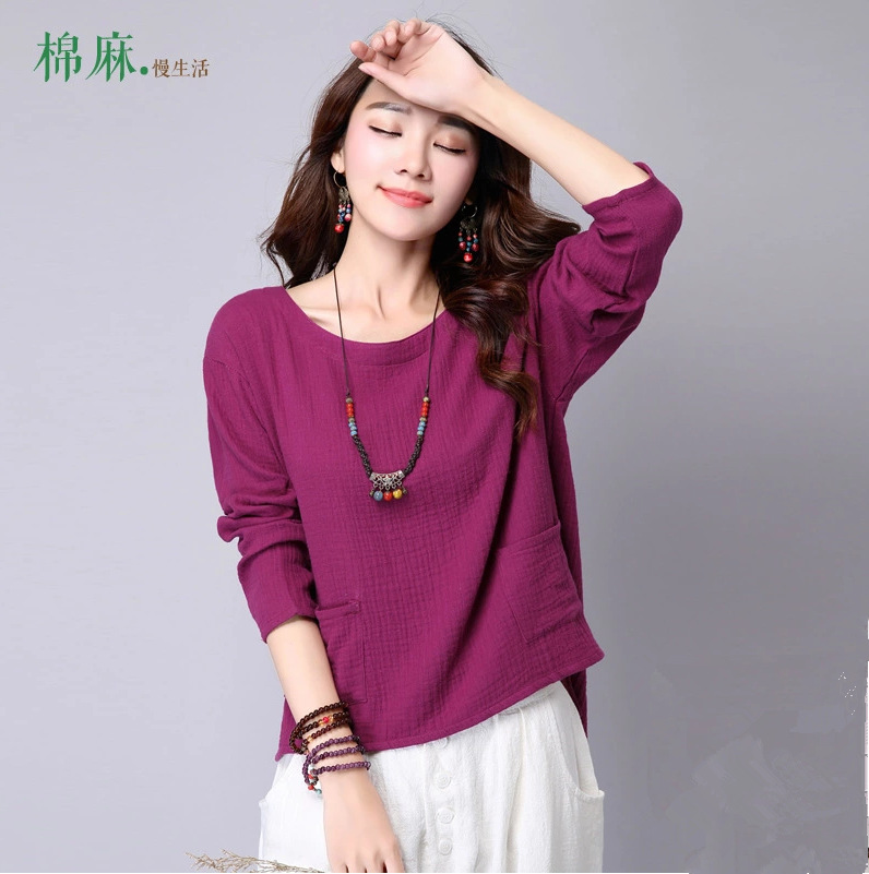 2015秋裝新款胖MM民族風(fēng)寬松棉麻t恤大碼棉麻女裝長袖上衣 /