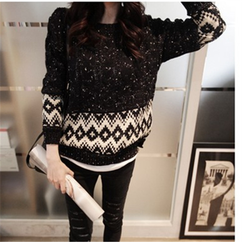 東大門2015秋冬新款韓國代購復古混色幾何圖案麻花長袖毛衣 /