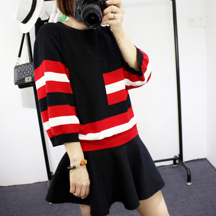 【實拍 現(xiàn)貨】韓版九分袖寬松圓領百搭條紋針織衫毛衣女 /