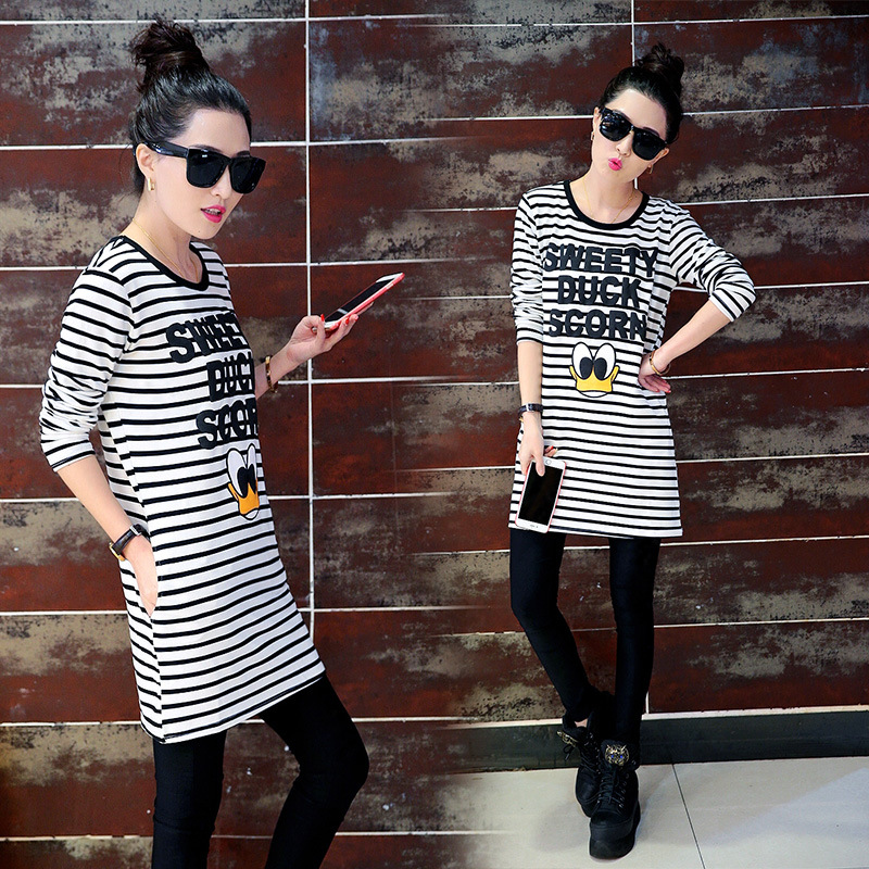 廠家直銷新款韓版條紋t恤大碼女裝長袖打底衫唐老鴨條紋T恤女潮 /