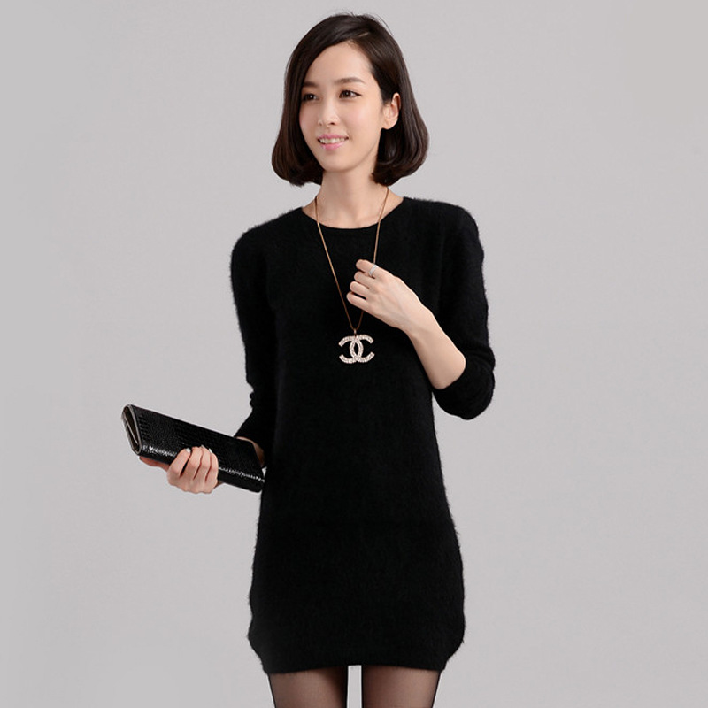 新款女裝韓版貂絨衫高端修身純色圓領(lǐng)羊毛衫中長(zhǎng)款貂絨打底連衣裙 /