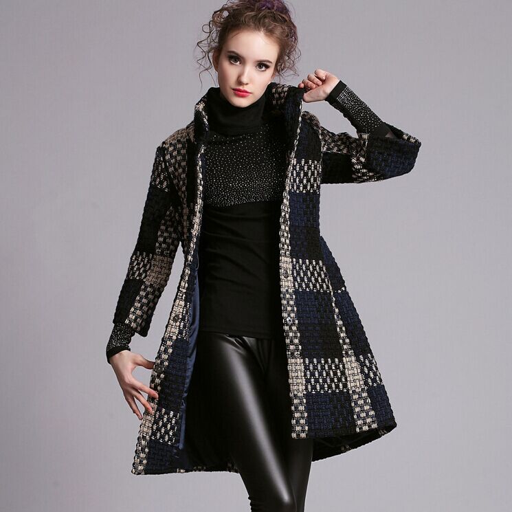 歐洲站2015秋冬女裝優(yōu)雅高端七分袖中長款立領(lǐng)毛呢網(wǎng)格外套大衣女 /