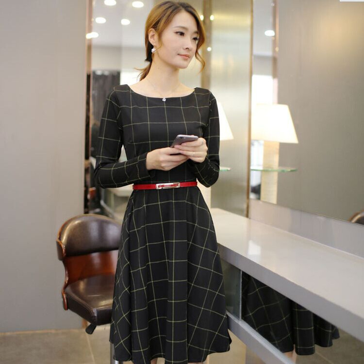 2015秋裝新款女裝韓版中長(zhǎng)款修身顯瘦系腰帶一字領(lǐng)格子長(zhǎng)袖連衣裙 /