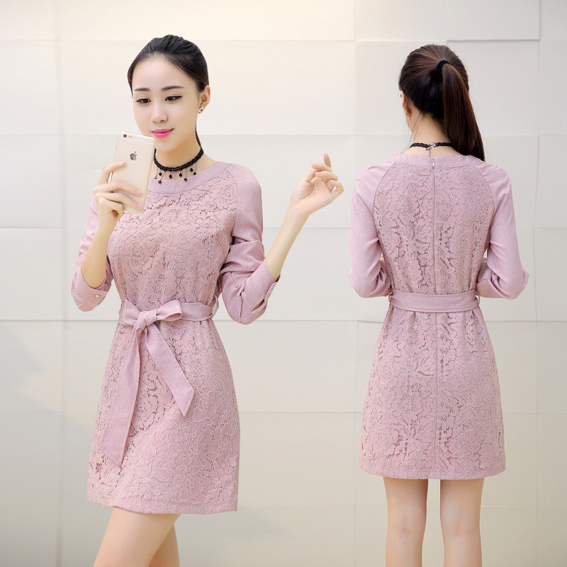 2015秋裝新款韓版女裝 圓領(lǐng)長(zhǎng)袖氣質(zhì)顯瘦打底A字裙 蕾絲連衣裙秋 /