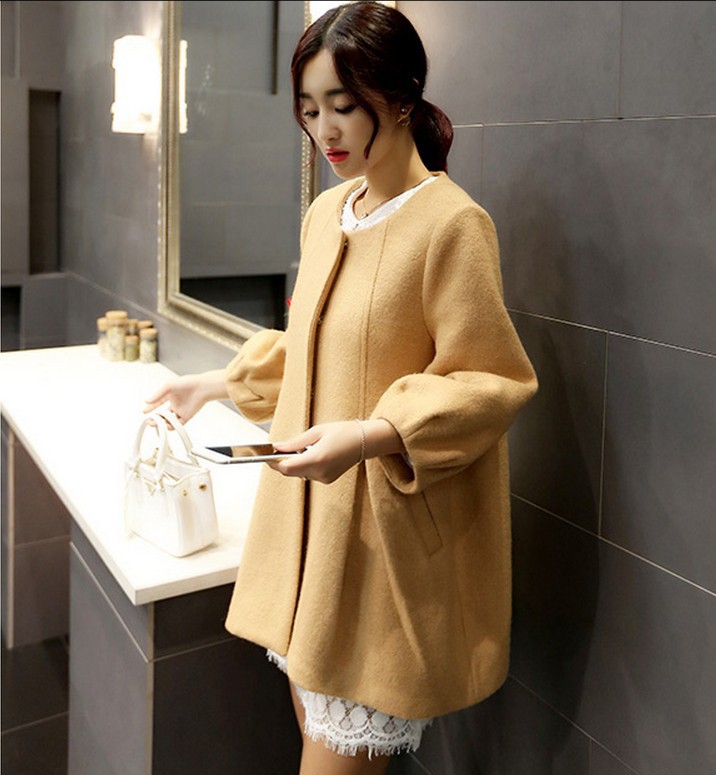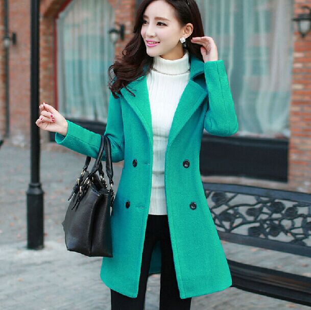 2015冬季新品女裝韓版修身中長款毛呢外套 /
