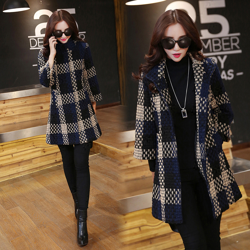 毛呢外套2015秋裝新款韓版修身中長款七分袖粗花呢子大衣大碼女 /
