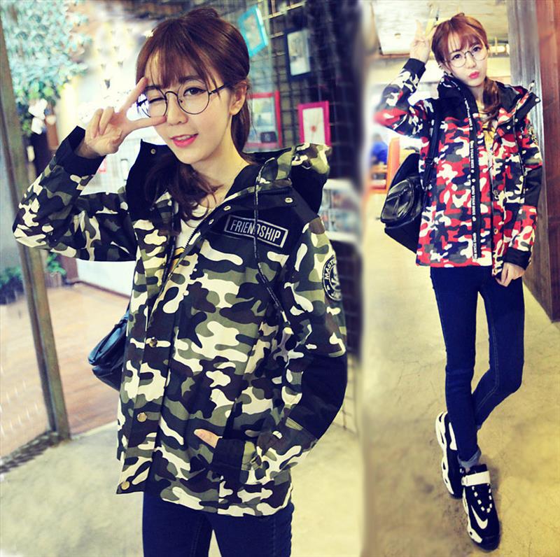 2015秋裝新款女裝大碼拼接寬松風(fēng)衣女刺繡連帽迷彩工裝學(xué)生外套 /