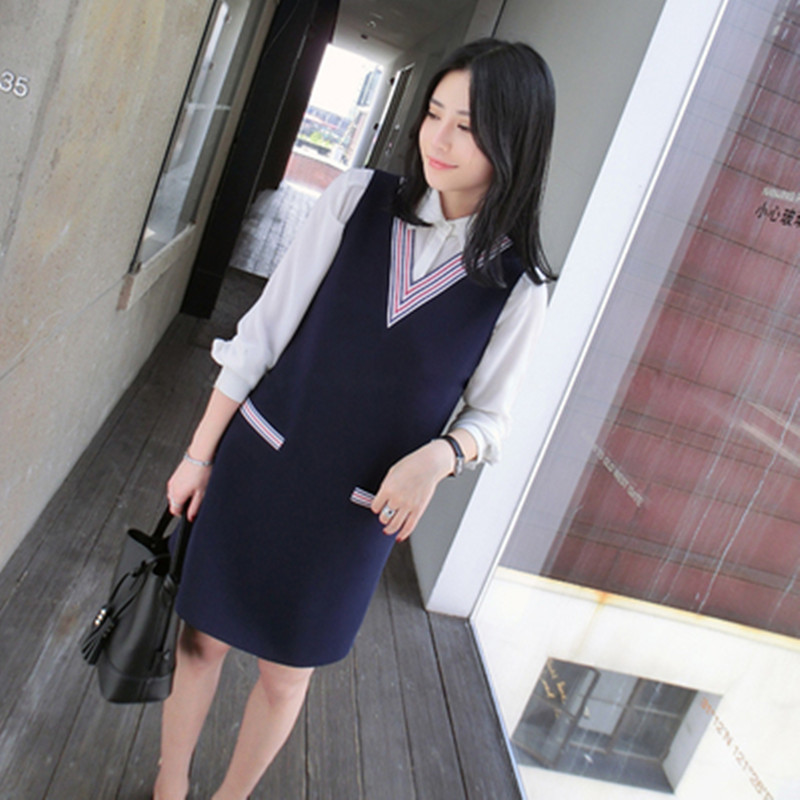 兩件套學(xué)院風(fēng)連衣裙秋韓版長袖白襯衫+條紋V領(lǐng)馬甲背心裙套 /