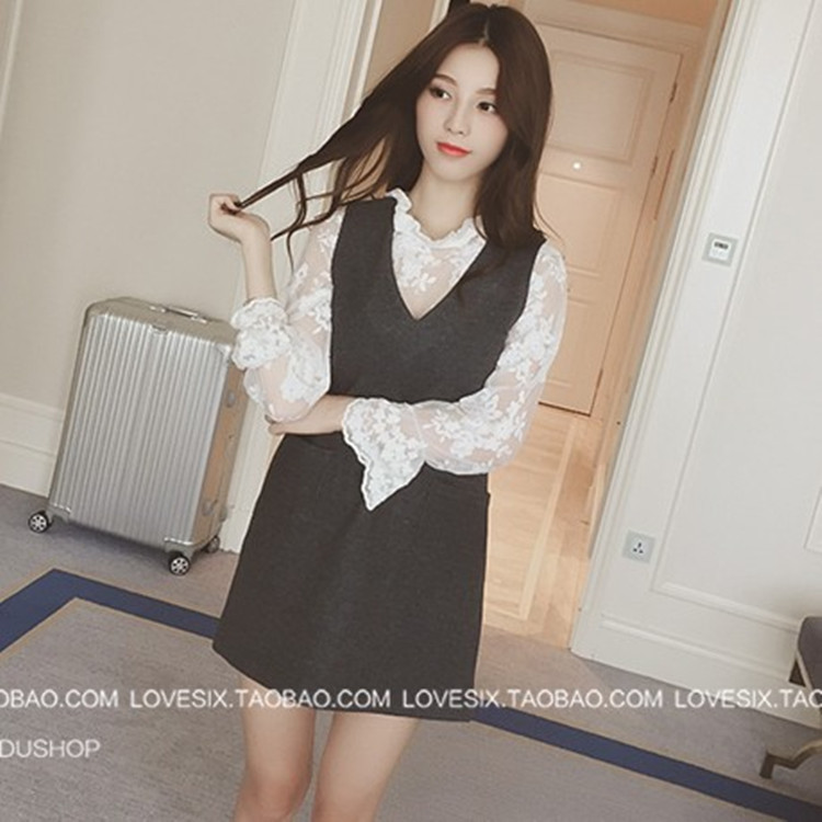 2015秋冬新款鏤空繡花花邊蕾絲衫口袋背心裙毛呢連衣裙呢子兩件套 /