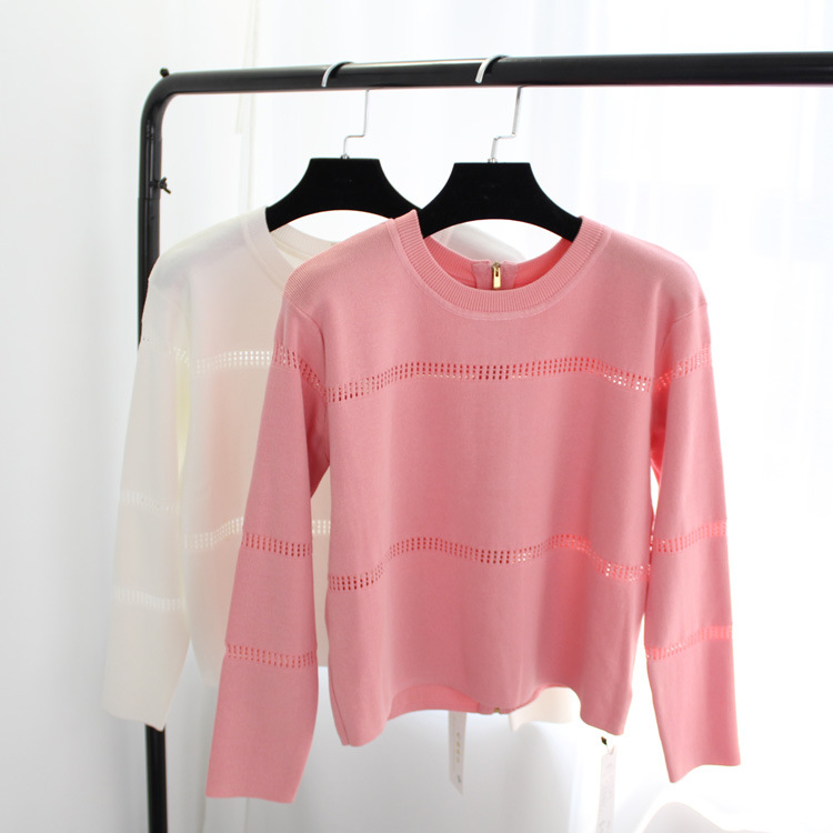 2015春秋新款歐美寬松套頭針織衫背后拉鏈圓領(lǐng)短款鏤空毛衣外套女 /