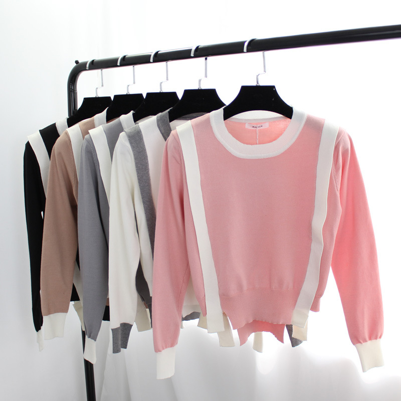2015秋冬新款打底針織衫長袖不規(guī)則下擺拼色拼接假兩件套頭上衣 /