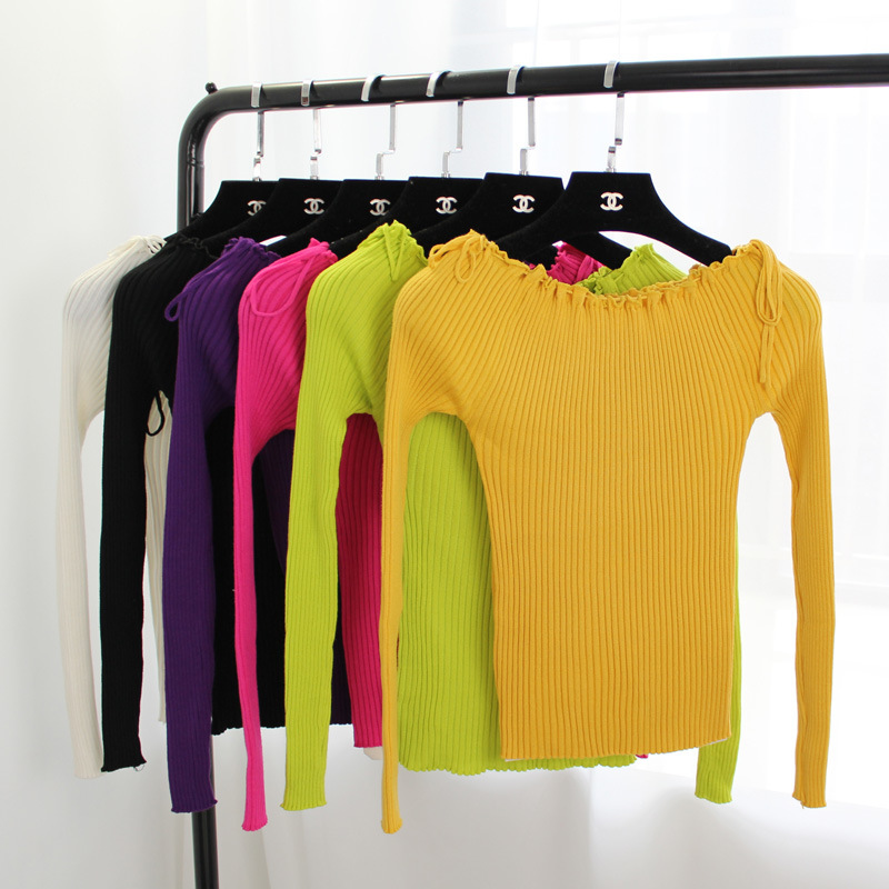2015秋冬季女韓版露肩抽繩系帶兩穿一字領(lǐng)修身顯瘦基礎(chǔ)打底針織衫 /