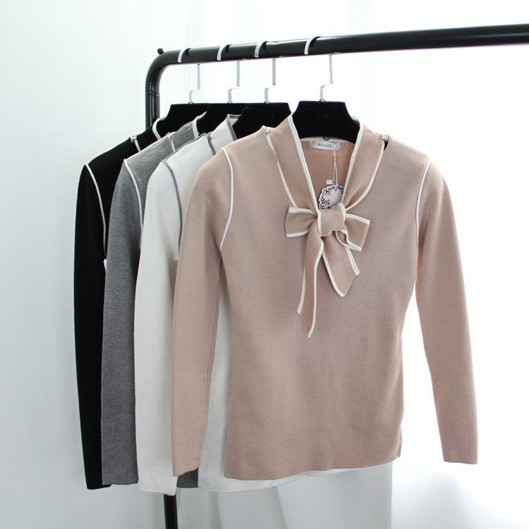 2015秋季新款韓版蝴蝶結(jié)V領(lǐng)長袖百搭修身顯瘦套頭打底針織衫女潮 /