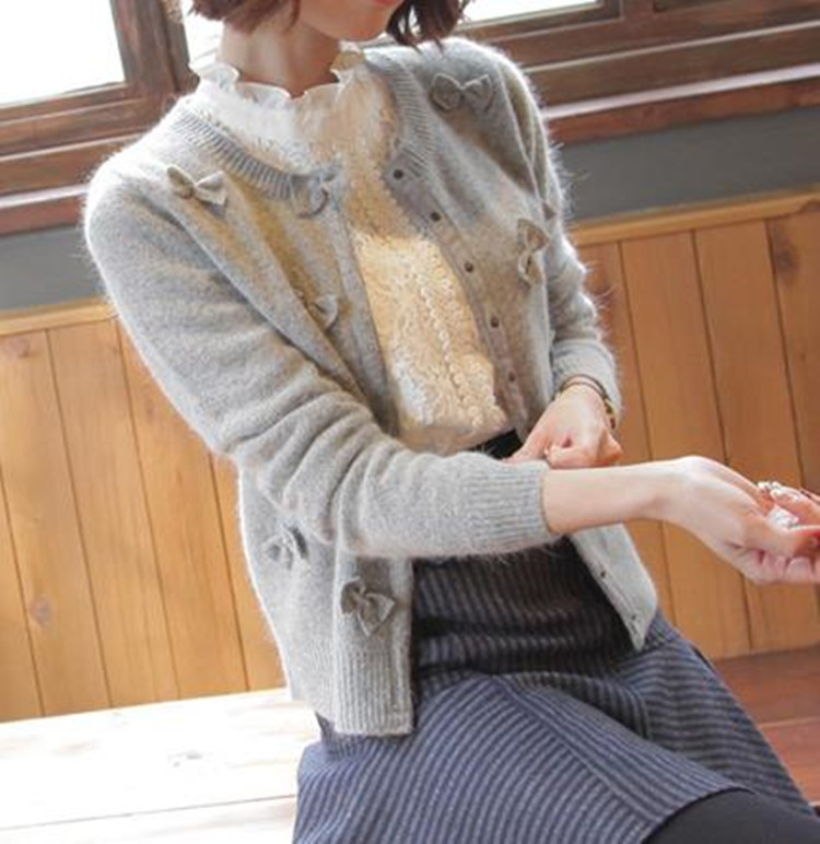 2015秋冬新款韓國代購時(shí)尚氣質(zhì)蝴蝶結(jié)兔毛針織開衫單排扣毛衣外套 /