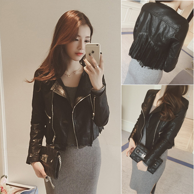 歐洲站歐美大牌長袖翻領(lǐng)干練流蘇拉鏈皮衣短外套女機(jī)車服潮 /
