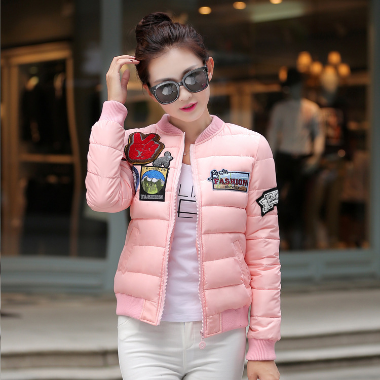 2015冬裝新款韓版棒球服立領棉衣徽章時尚修身短款羽絨服女款批發(fā) /