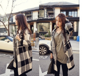 韓國(guó)大牌氣場(chǎng)寬松針織衫毛衣外套 女 時(shí)尚靚麗格子開衫雙鈕扣大衣 /
