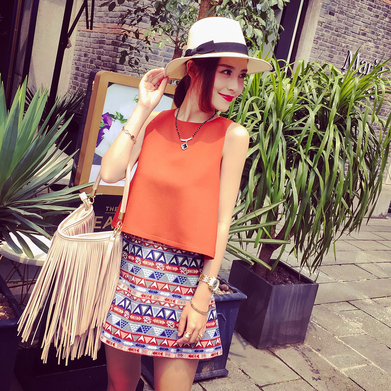 今日?qǐng)F(tuán)2015夏裝新款時(shí)尚名媛氣質(zhì)A字背心+復(fù)古顯瘦短裙套裝 /