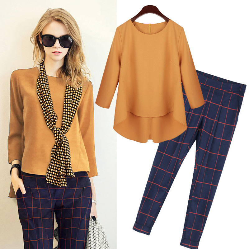 歐美街頭長(zhǎng)袖上衣女裝T恤衫格子休閑褲兩件套休閑時(shí)尚套裝 /