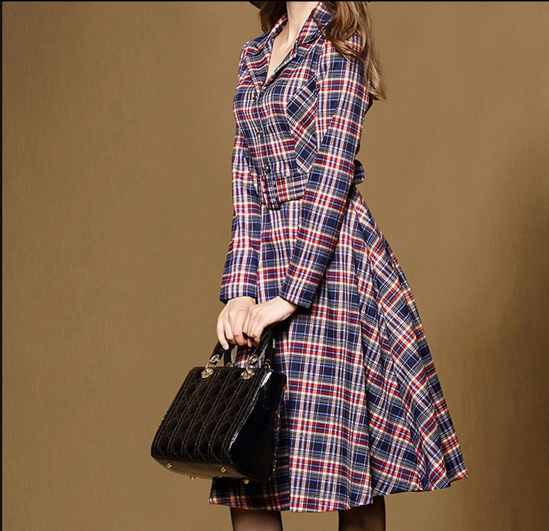 2015秋裝新款高端大牌氣質翻領經典格紋中長連衣裙女裝外套 /