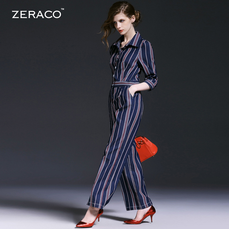 歐美女裝秋季新款2015爆款熱賣豎條紋襯衣領(lǐng)半開衫洗水牛仔連體褲 /
