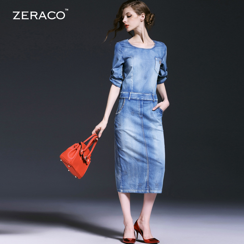 2015歐洲站女裝秋季新款熱洗水牛仔鏤空圓領(lǐng)中袖修身包臀連衣裙 /