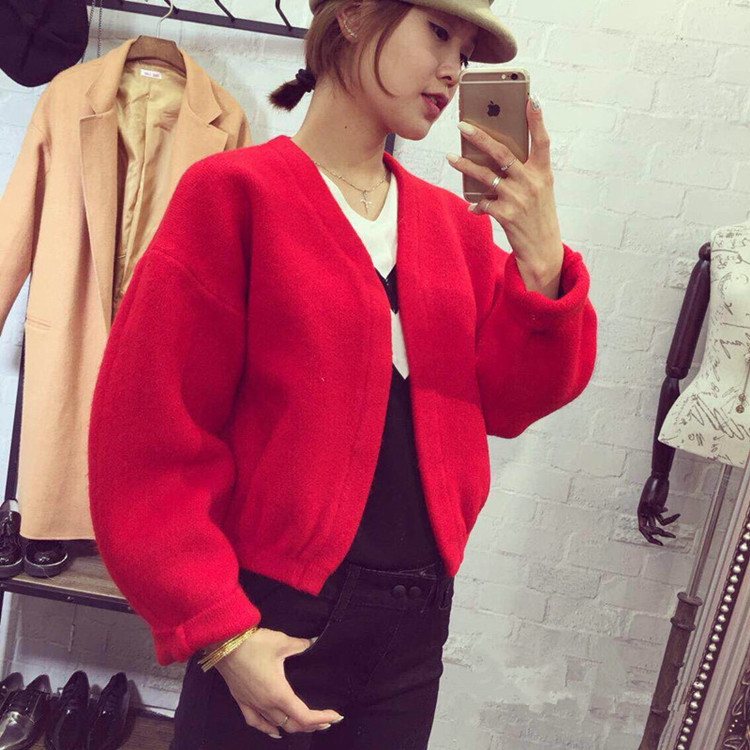 2015新款女裝韓版紅色小開衫寬松加厚蝙蝠袖針織衫毛衣外套女冬 /