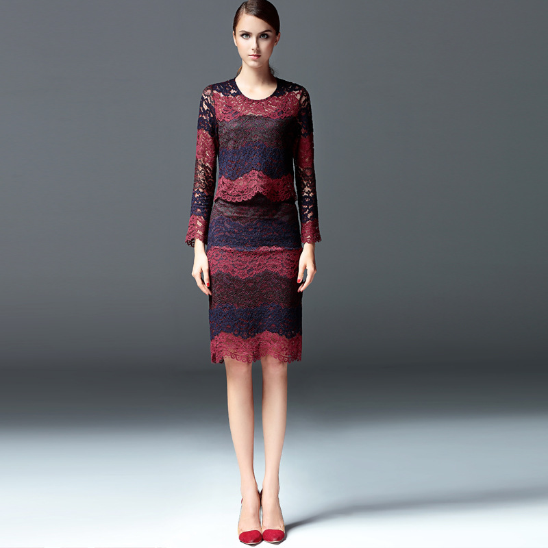 2015秋季新女長(zhǎng)袖套裝 蕾絲兩件套時(shí)尚歐美品牌圓領(lǐng)修身 /