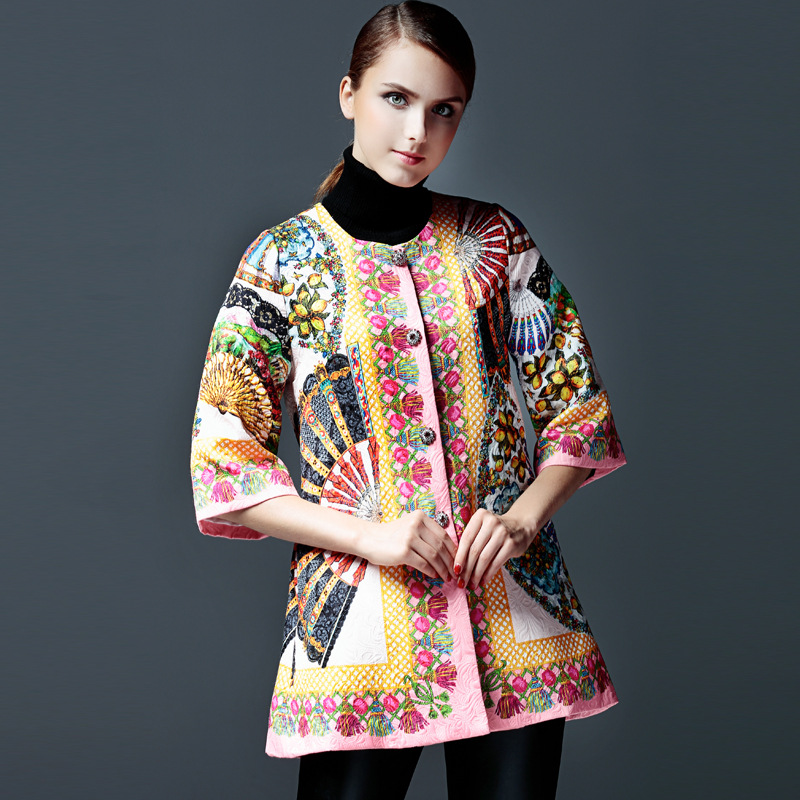 秋冬新品女服裝 歐美印花寬松七分袖中長(zhǎng)款外套大衣女代發(fā) /