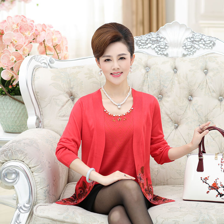 新款2015秋裝中老年女裝鑲鉆長袖針織衫羊毛衫T恤媽媽裝兩件套批 /