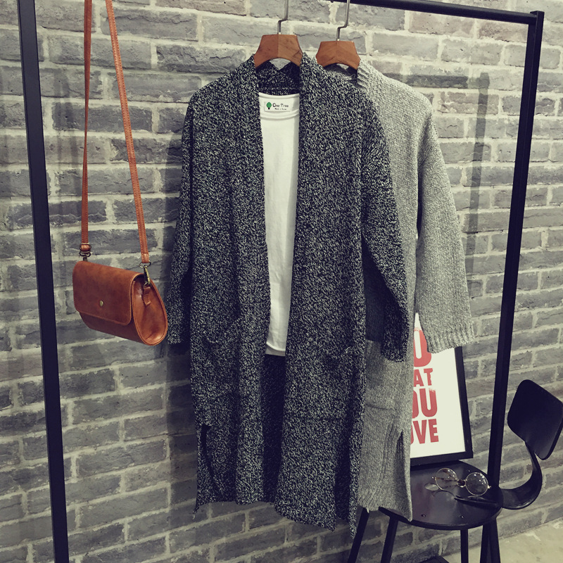 2015秋冬新款針織開衫 韓國復(fù)古加長款毛衣寬松混色口袋女士外套 /