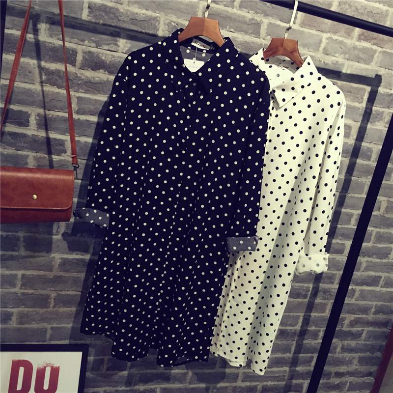 韓國東大門波點雪紡襯衫女 2015秋裝寬松長款襯衣長袖翻領(lǐng)襯衫裙 /