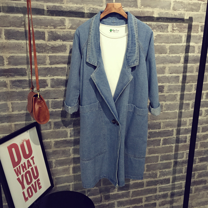 2015秋韓國東大門牛仔風(fēng)衣女 BF風(fēng)復(fù)古外套長款寬松翻領(lǐng)大衣批發(fā) /