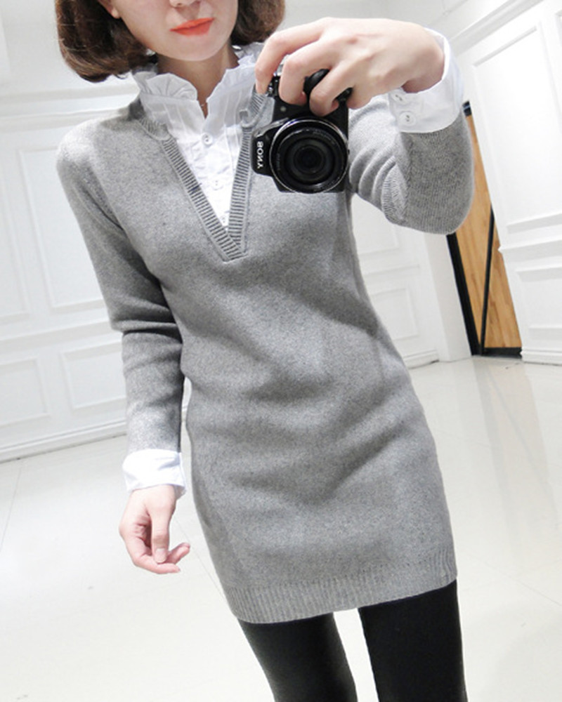 2015秋裝韓版針織衫女套頭假兩件套長袖高領(lǐng)毛衣女厚修身打底衫女 /