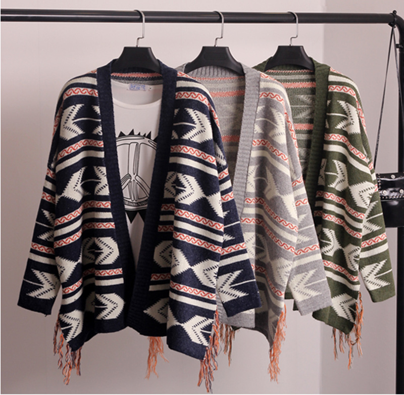 2015秋裝韓版針織衫開衫蝙蝠衫長袖幾何流蘇披肩毛衣女斗篷外套女 /
