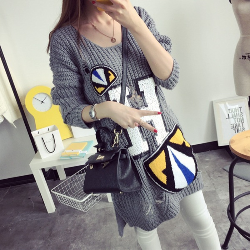 歐洲站2015秋裝韓版針織衫女寬松中長款套頭長袖毛衣女明星同款 /