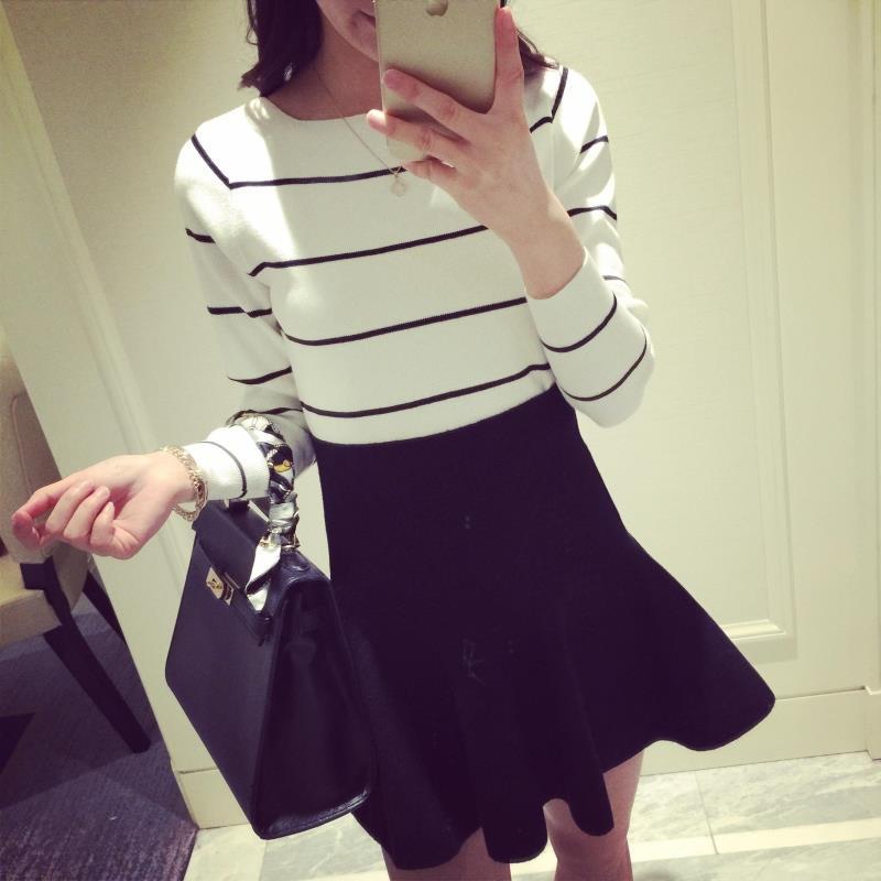 秋裝長袖針織衫毛衣女一字領(lǐng)開叉黑白條韓版打底衫明星趙麗穎同款 /