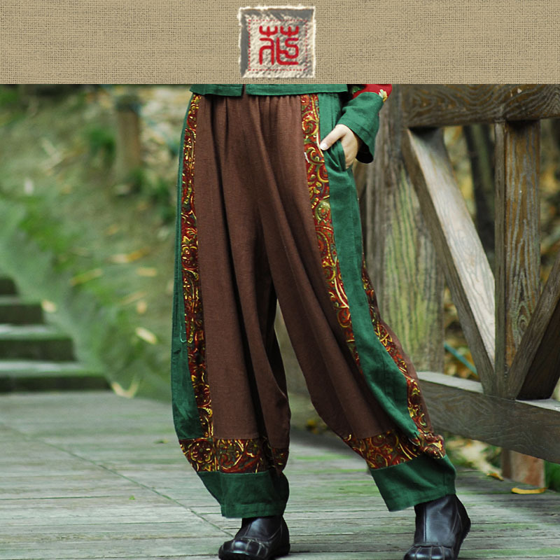 花開半夏秋冬新款民族風(fēng)棉麻女式松緊腰燈籠褲心畫紅羽拼接闊腿褲 /