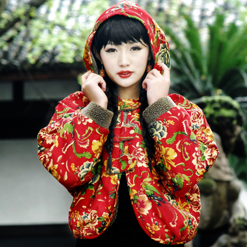 花開半夏2014新款民族風(fēng)女裝冬裝花布棉服貼布繡毛邊立領(lǐng)盤扣 /