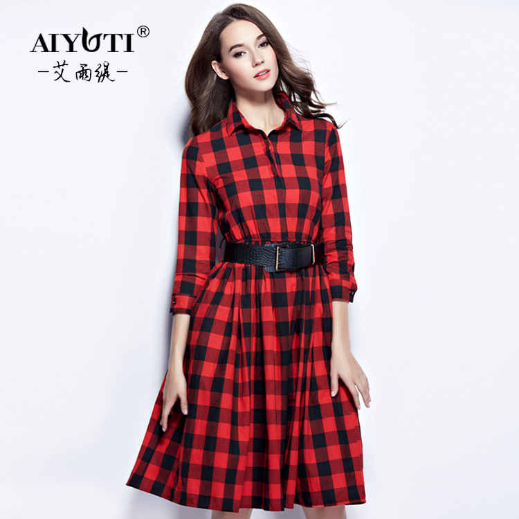 秋季新品深圳女裝時尚歐美品牌連衣裙 高端格紋七分袖大擺裙批發(fā) /