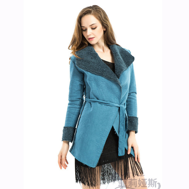 廠家直銷 速賣通eBay貨源專供歐美大碼皮毛一體蘭色系帶長外套女 /