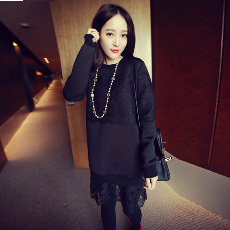 秋冬新款 韓版顯瘦蕾絲拼接長袖連衣裙(加絨加厚) /